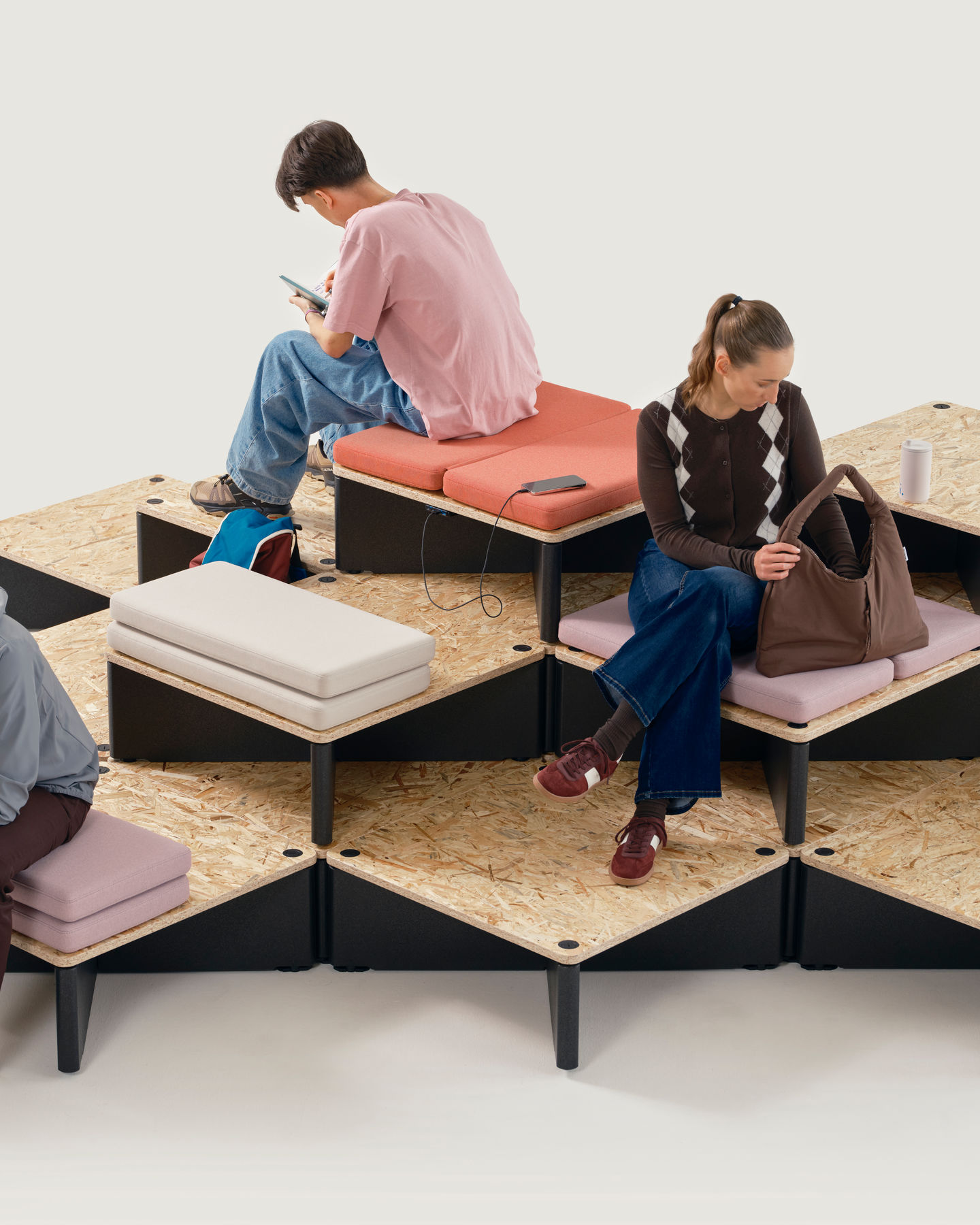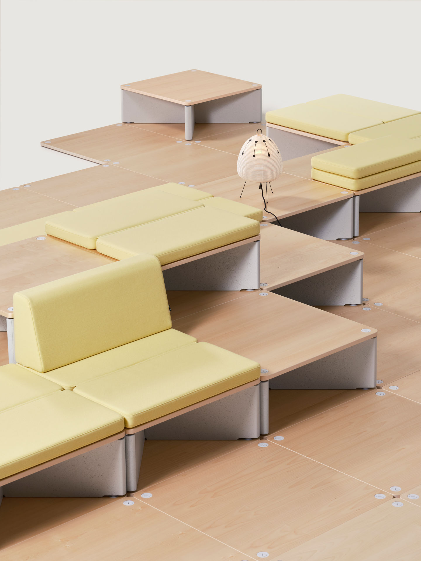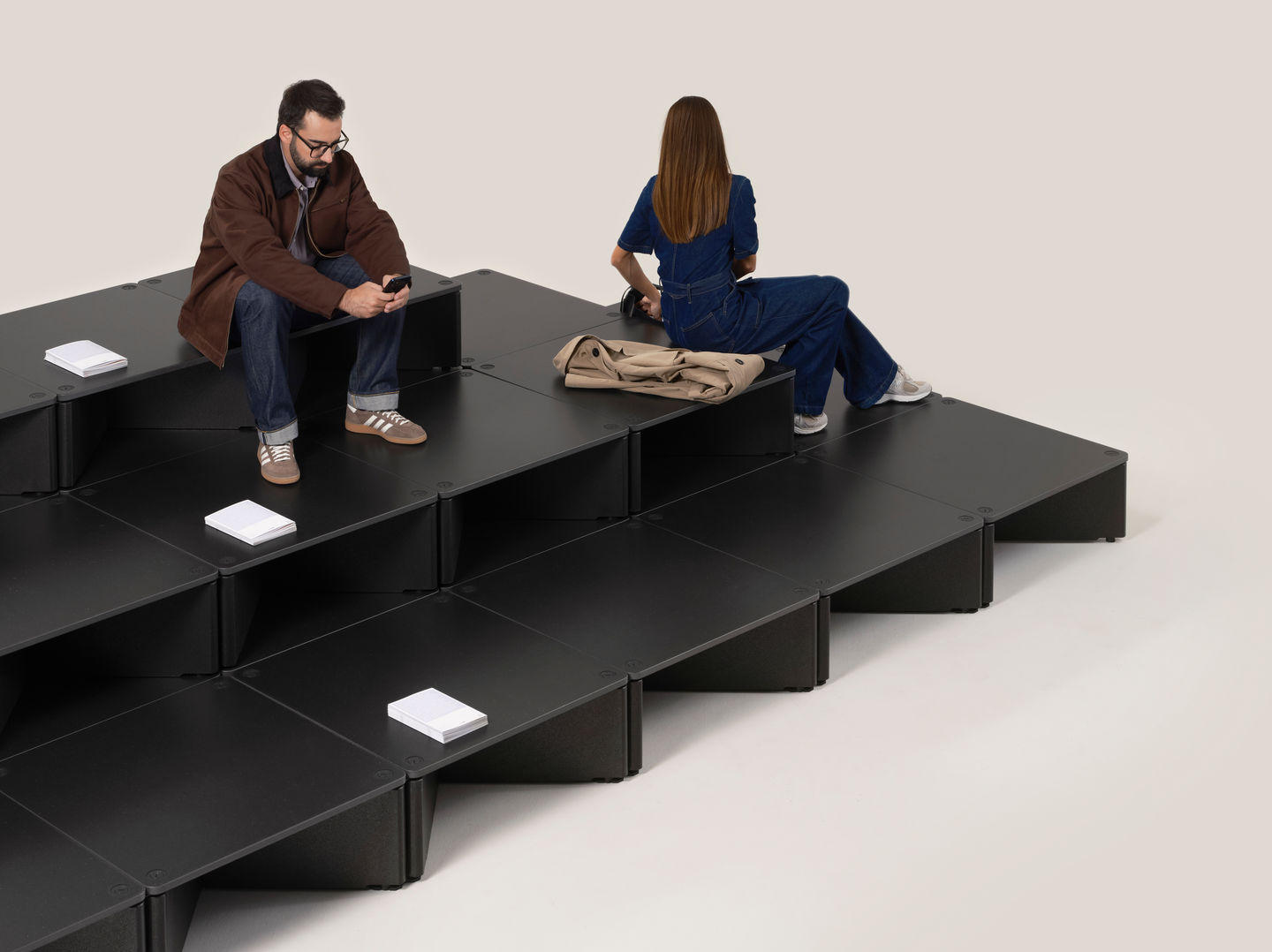 Dank des modularen Reset-Systems lassen sich gestufte Bodenstrukturen so einfach wie mit Bauklötzen zusammenbauen, umgestalten demontieren, entfernen und wieder aufbauen. Zwischenbereiche, Wartezonen und bisher ungenutzte Räume können ohne grossen Planungs- oder Umbauaufwand effizient genutzt werden – beispielsweise für kommunikationsfreundliche Besprechungslandschaften, Sofas für informelle Gespräche, Inseln für ruhiges Arbeiten, Arenen oder forumähnliche Plattformen sowie Ausstellungsinstallationen und vieles mehr.
