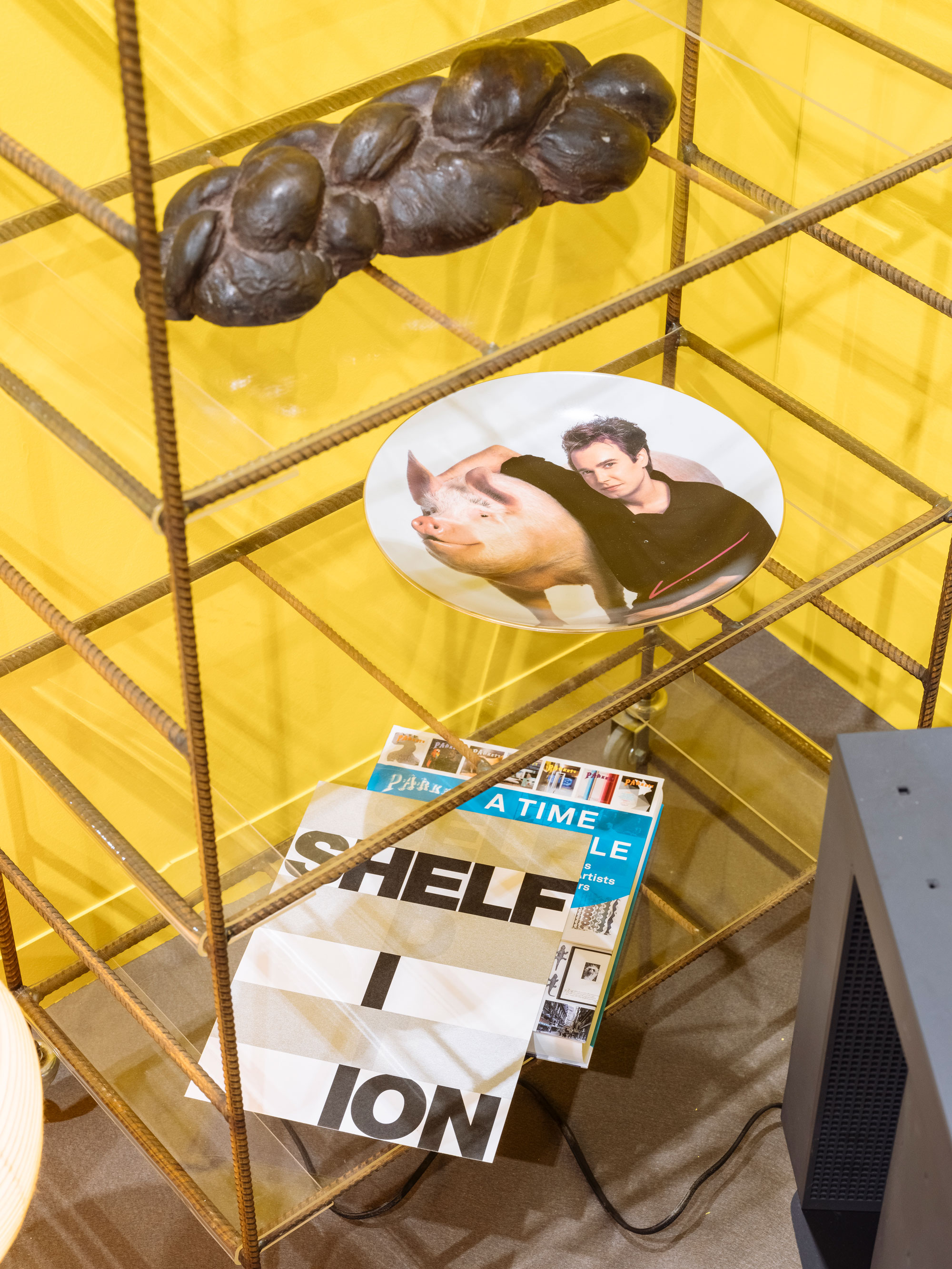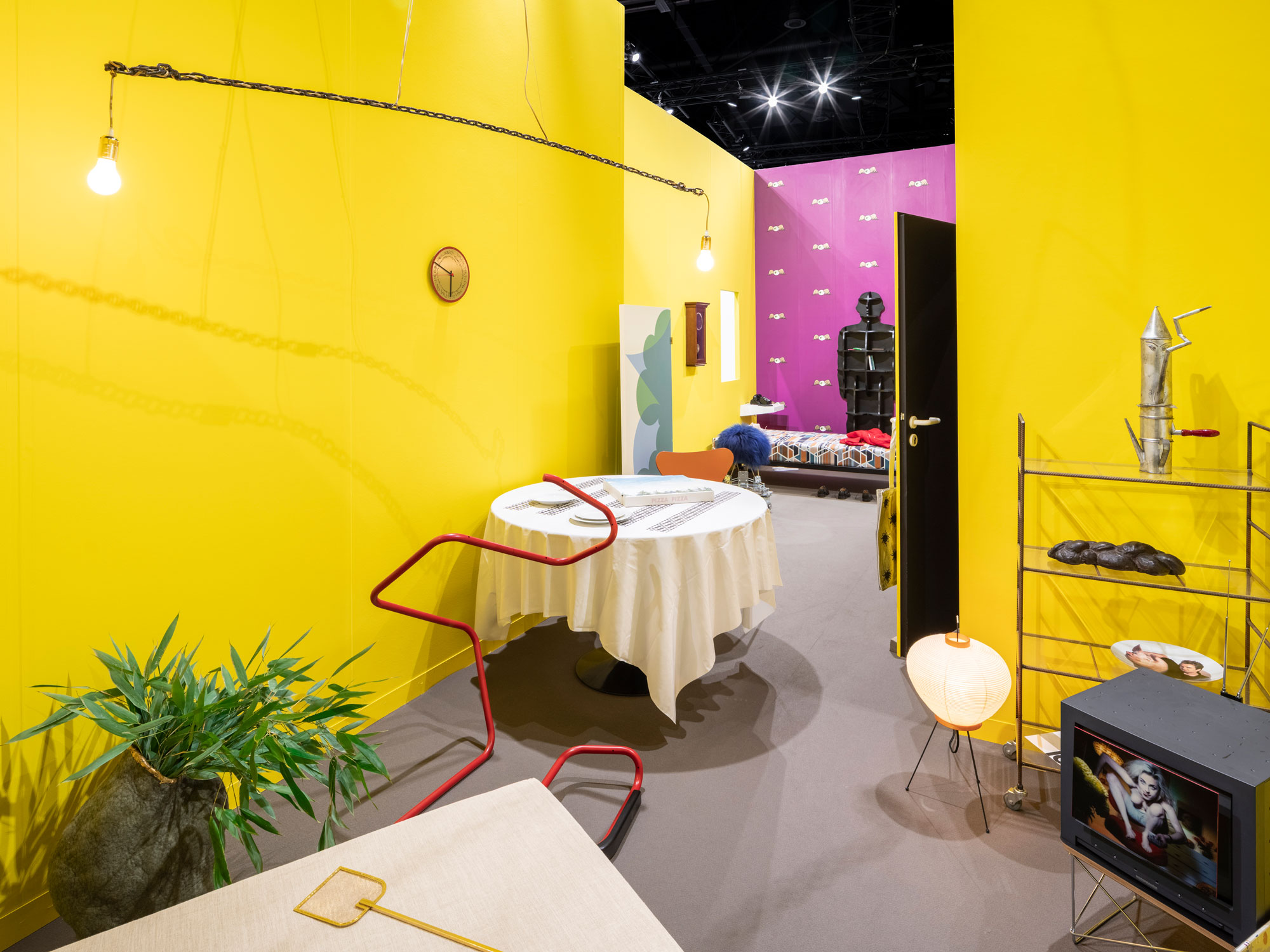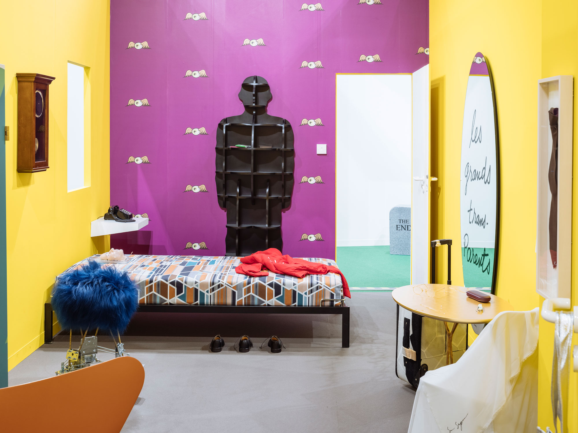 Stand B55 war demnach als geschlossenes Interieur konzipiert, das nahezu vollständig aus Kunstwerken bestand. Zu sehen waren historische Arbeiten wie Marion Baruchs Sitzskulptur «Ron Ron» im Dialog mit zeitgenössischen Positionen unter anderem von Sylvie Fleury, Lorenza Longhi, Daniel Buren oder Urban Zellweger. Ergänzt wurde die Präsentation durch Leihgaben aus Institutionen, Galerien und von «Parkett».