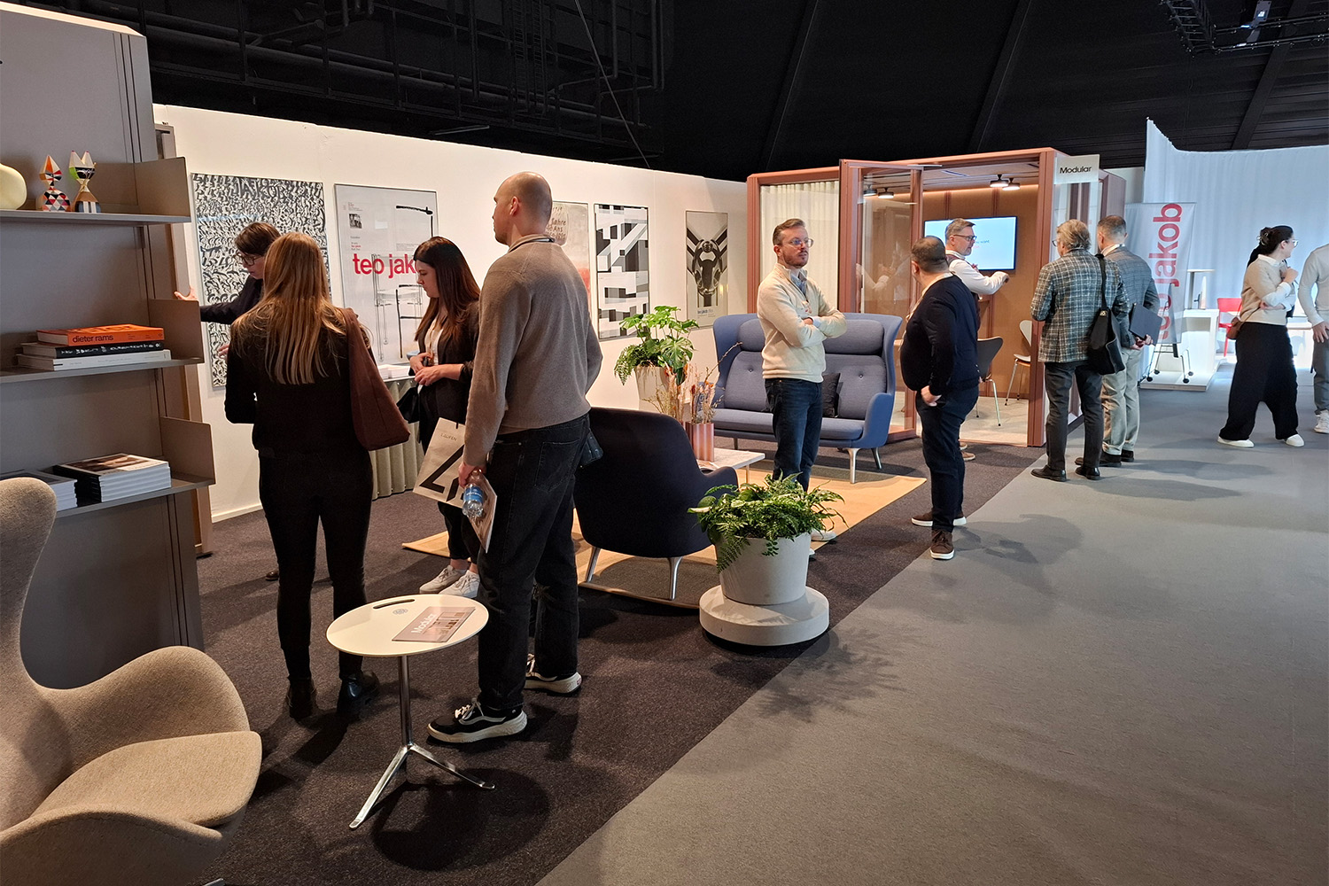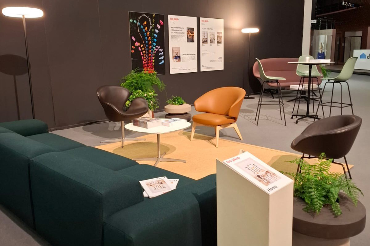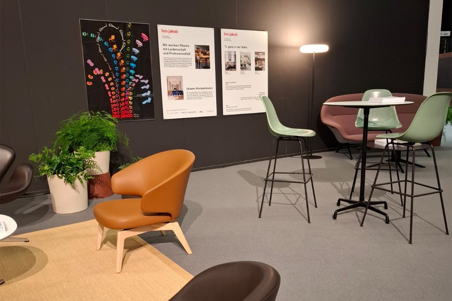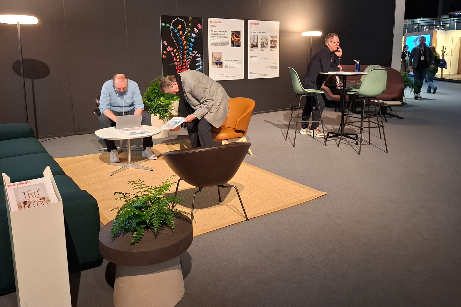 Neben unserem Stand gestaltet teo jakob im öffentlichen Messebereich zwei Lounges. Sie sind als Ruheinseln konzipiert, zum Ankommen, Ausruhen und für Gespräche, die Substanz haben. Die Planung und Umsetzung erfolgt gemeinsam mit Seleform, Vitra und Luwasa.